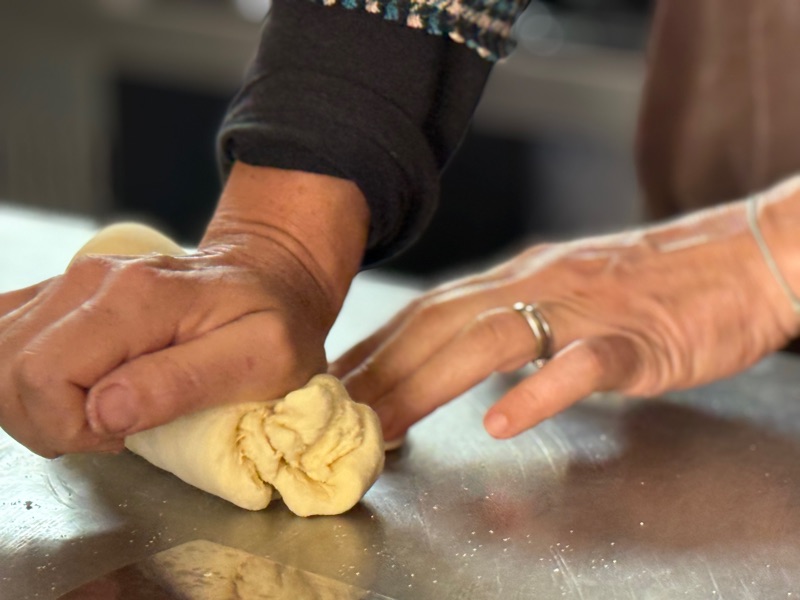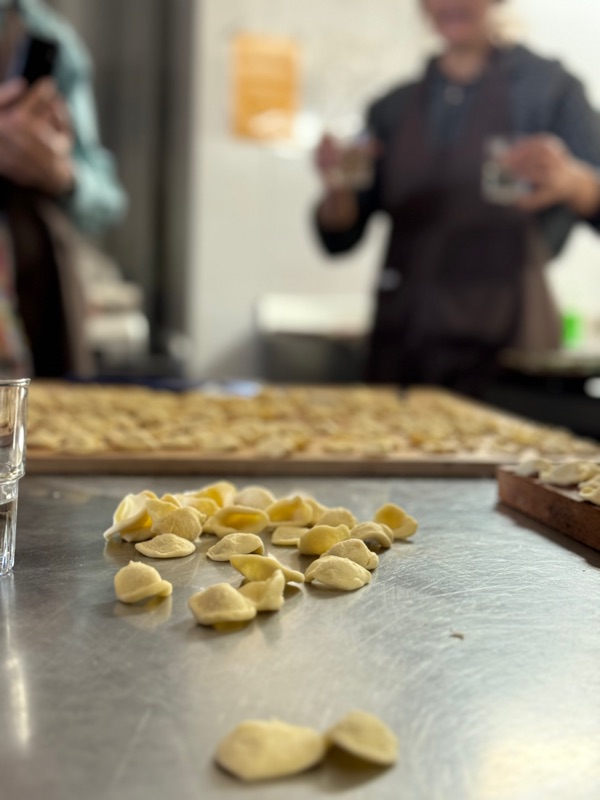I never thought I’d rave about mozzarella cheese, but oh. After I died via cheese tasting three or four times there, we continued on to a cooking class at a local masseria (fortified farmhouse from the Middle Ages). There we participated in making little pasta ears and a stew of thin rolled beef. I was pretty useless with one arm but I managed a few little ears.